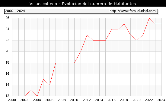 el numero de habitantes en Villaescobedo era de 25, igual numero de habitantes que el en el año 2023. En el grafico siguiente se puede ver cuantos habitantes tiene Villaescobedo a lo largo de los años.