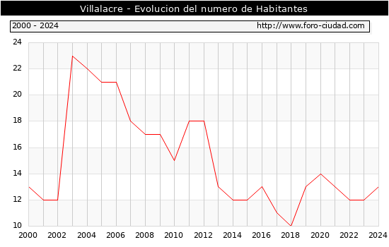 el numero de habitantes en Villalacre era de 13, 1 habitantes mas que el en el año 2023. En el grafico siguiente se puede ver cuantos habitantes tiene Villalacre a lo largo de los años.