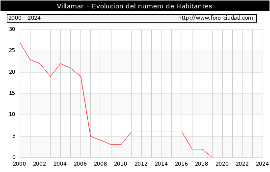 Segun los datos publicados por el INE a 1 de Enero de 2024 el numero de habitantes en Villamar era de 0, igual numero de habitantes que el en el año 2023. En el grafico siguiente se puede ver cuantos habitantes tiene Villamar a lo largo de los años.