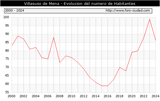 el numero de habitantes en Villasuso de Mena era de 86, 13 habitantes menos que el en el año 2023. En el grafico siguiente se puede ver cuantos habitantes tiene Villasuso de Mena a lo largo de los años.