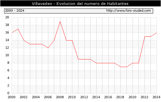 el numero de habitantes en Villavedeo era de 16, 1 habitantes mas que el en el año 2023. En el grafico siguiente se puede ver cuantos habitantes tiene Villavedeo a lo largo de los años.