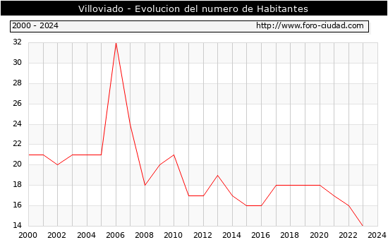 el numero de habitantes en Villoviado era de 14, igual numero de habitantes que el en el año 2023. En el grafico siguiente se puede ver cuantos habitantes tiene Villoviado a lo largo de los años.