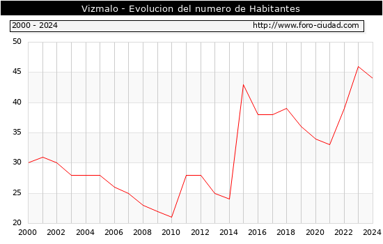 el numero de habitantes en Vizmalo era de 44, 2 habitantes menos que el en el año 2023. En el grafico siguiente se puede ver cuantos habitantes tiene Vizmalo a lo largo de los años.