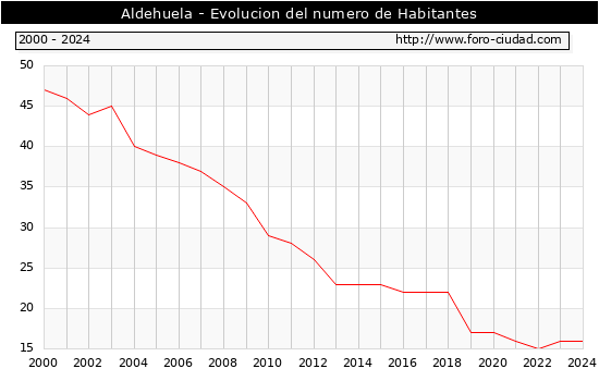 el numero de habitantes en Aldehuela era de 16, igual numero de habitantes que el en el año 2023. En el grafico siguiente se puede ver cuantos habitantes tiene Aldehuela a lo largo de los años.