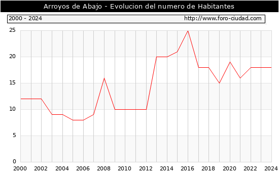 el numero de habitantes en Arroyos de Abajo era de 18, igual numero de habitantes que el en el año 2023. En el grafico siguiente se puede ver cuantos habitantes tiene Arroyos de Abajo a lo largo de los años.