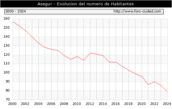el numero de habitantes en Asegur era de 79, 7 habitantes menos que el en el año 2023. En el grafico siguiente se puede ver cuantos habitantes tiene Asegur a lo largo de los años.