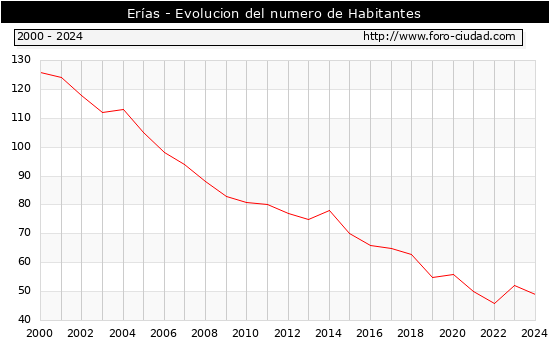 el numero de habitantes en Erías era de 49, 3 habitantes menos que el en el año 2023. En el grafico siguiente se puede ver cuantos habitantes tiene Erías a lo largo de los años.