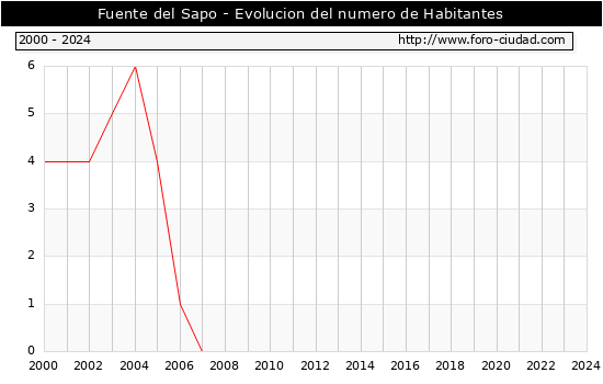 el numero de habitantes en Fuente del Sapo era de 0, igual numero de habitantes que el en el año 2023. En el grafico siguiente se puede ver cuantos habitantes tiene Fuente del Sapo a lo largo de los años.