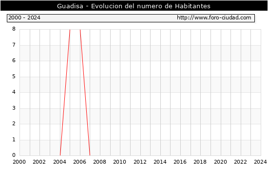 el numero de habitantes en Guadisa era de 0, igual numero de habitantes que el en el año 2023. En el grafico siguiente se puede ver cuantos habitantes tiene Guadisa a lo largo de los años.