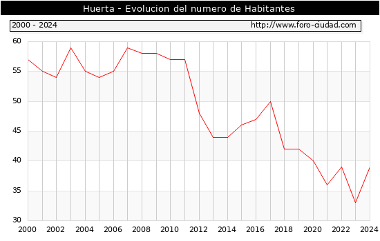 el numero de habitantes en Huerta era de 39, 6 habitantes mas que el en el año 2023. En el grafico siguiente se puede ver cuantos habitantes tiene Huerta a lo largo de los años.