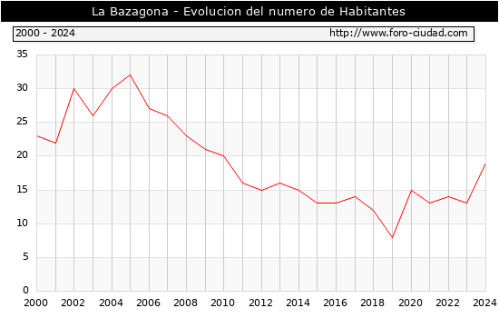 Segun los datos publicados por el INE a 1 de Enero de 2024 el numero de habitantes en La Bazagona era de 19, 6 habitantes mas que el en el año 2023. En el grafico siguiente se puede ver cuantos habitantes tiene La Bazagona a lo largo de los años.