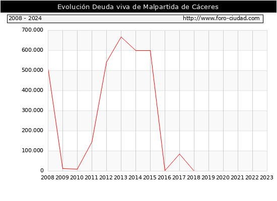 Malpartida de Cáceres - Deuda viva del Ayuntamiento a 31/12/2024 Malpartida de Cáceres - Deuda viva del Ayuntamiento a 31/12/2024 Segun el Ministerio de Economia y Hacienda el Ayuntamiento de Malpartida de Cáceres a 31/12/2024 posee una deuda de 101.000 € . La deuda viva a 31/12/2023 ascendia a 0 € por lo que en el ultimo año la deuda crecio en 101.000 €. ![]()