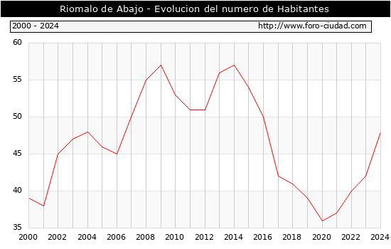 el numero de habitantes en Riomalo de Abajo era de 48, 6 habitantes mas que el en el año 2023. En el grafico siguiente se puede ver cuantos habitantes tiene Riomalo de Abajo a lo largo de los años.