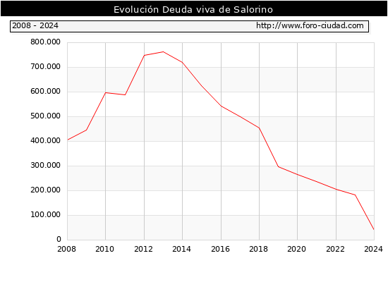 Salorino - Deuda viva del Ayuntamiento a 31/12/2024 Salorino - Deuda viva del Ayuntamiento a 31/12/2024 Segun el Ministerio de Economia y Hacienda el Ayuntamiento de Salorino a 31/12/2024 posee una deuda de 41.000 € . La deuda viva a 31/12/2023 ascendia a 183.000 € por lo que en el ultimo año la deuda se redujo en -142.000 €. ![]()