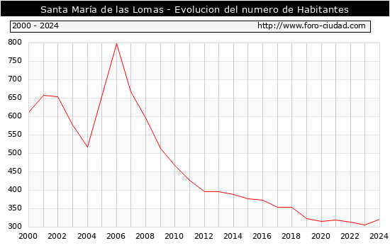 el numero de habitantes en Santa María de las Lomas era de 322, 16 habitantes mas que el en el año 2023. En el grafico siguiente se puede ver cuantos habitantes tiene Santa María de las Lomas a lo largo de los años.