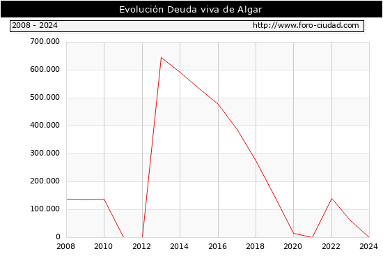 Algar - Deuda viva del Ayuntamiento a 31/12/2024 Algar - Deuda viva del Ayuntamiento a 31/12/2024 Segun el Ministerio de Economia y Hacienda el Ayuntamiento de Algar a 31/12/2024 posee una deuda de 0 € . La deuda viva a 31/12/2023 ascendia a 60.000 € por lo que en el ultimo año la deuda se redujo en -60.000 €. ![]()