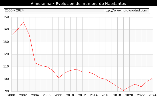 el numero de habitantes en Almoraima era de 101, 3 habitantes mas que el en el año 2023. En el grafico siguiente se puede ver cuantos habitantes tiene Almoraima a lo largo de los años.