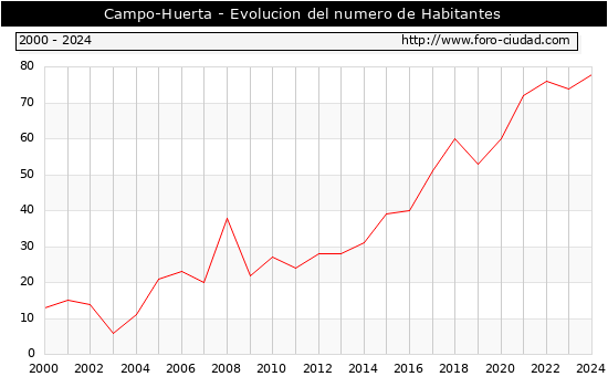 el numero de habitantes en Campo-Huerta era de 78, 4 habitantes mas que el en el año 2023. En el grafico siguiente se puede ver cuantos habitantes tiene Campo-Huerta a lo largo de los años.