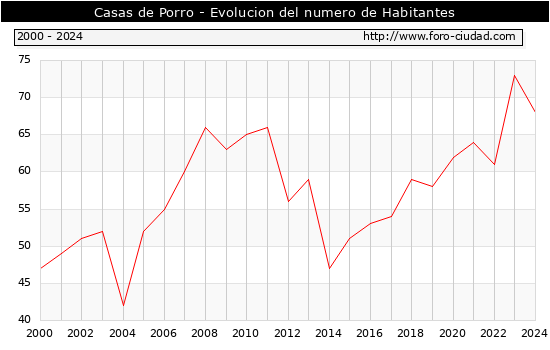 el numero de habitantes en Casas de Porro era de 68, 5 habitantes menos que el en el año 2023. En el grafico siguiente se puede ver cuantos habitantes tiene Casas de Porro a lo largo de los años.