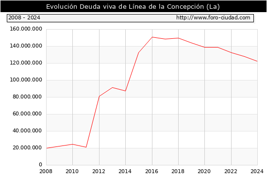 La Línea de la Concepción - Deuda viva del Ayuntamiento a 31/12/2024 La Línea de la Concepción - Deuda viva del Ayuntamiento a 31/12/2024 Segun el Ministerio de Economia y Hacienda el Ayuntamiento de La Línea de la Concepción a 31/12/2024 posee una deuda de 122.103.000 € . La deuda viva a 31/12/2023 ascendia a 127.795.000 € por lo que en el ultimo año la deuda se redujo en -5.692.000 €. ![]()