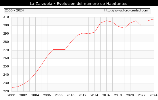 el numero de habitantes en La Zarzuela era de 308, 2 habitantes mas que el en el año 2023. En el grafico siguiente se puede ver cuantos habitantes tiene La Zarzuela a lo largo de los años.