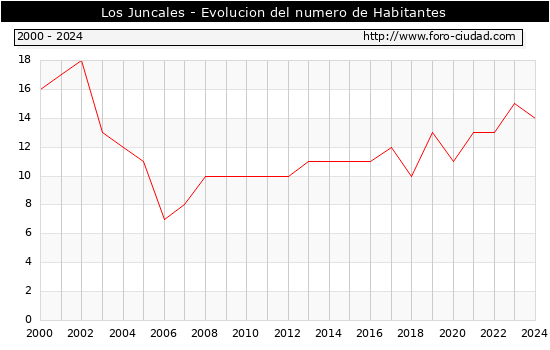 el numero de habitantes en Los Juncales era de 14, 1 habitantes menos que el en el año 2023. En el grafico siguiente se puede ver cuantos habitantes tiene Los Juncales a lo largo de los años.