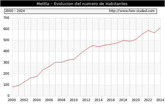 el numero de habitantes en Melilla era de 616, 49 habitantes mas que el en el año 2023. En el grafico siguiente se puede ver cuantos habitantes tiene Melilla a lo largo de los años.