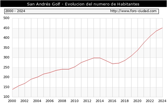 el numero de habitantes en San Andrés Golf era de 452, 17 habitantes mas que el en el año 2023. En el grafico siguiente se puede ver cuantos habitantes tiene San Andrés Golf a lo largo de los años.