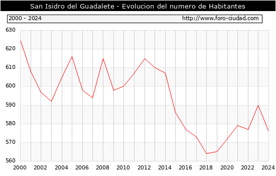 el numero de habitantes en San Isidro del Guadalete era de 576, 14 habitantes menos que el en el año 2023. En el grafico siguiente se puede ver cuantos habitantes tiene San Isidro del Guadalete a lo largo de los años.