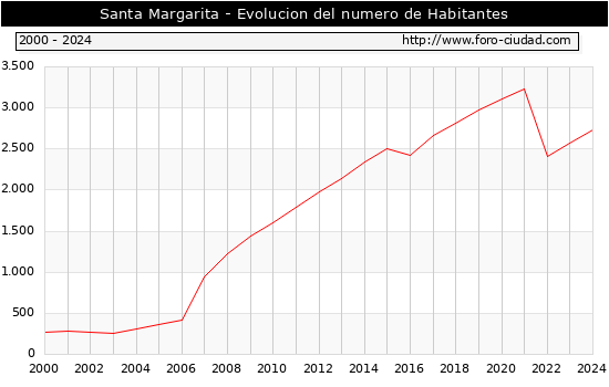 el numero de habitantes en Santa Margarita era de 2.734, 165 habitantes mas que el en el año 2023. En el grafico siguiente se puede ver cuantos habitantes tiene Santa Margarita a lo largo de los años.