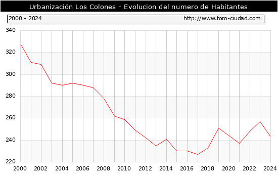 el numero de habitantes en Urbanización Los Colones era de 243, 14 habitantes menos que el en el año 2023. En el grafico siguiente se puede ver cuantos habitantes tiene Urbanización Los Colones a lo largo de los años.