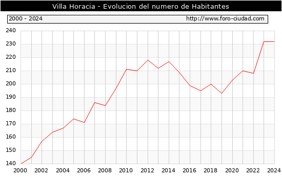 el numero de habitantes en Villa Horacia era de 232, igual numero de habitantes que el en el año 2023. En el grafico siguiente se puede ver cuantos habitantes tiene Villa Horacia a lo largo de los años.