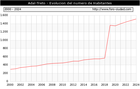el numero de habitantes en Adal-Treto era de 1.512, 36 habitantes mas que el en el año 2023. En el grafico siguiente se puede ver cuantos habitantes tiene Adal-Treto a lo largo de los años.