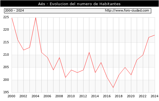 el numero de habitantes en Aés era de 218, 1 habitantes mas que el en el año 2023. En el grafico siguiente se puede ver cuantos habitantes tiene Aés a lo largo de los años.