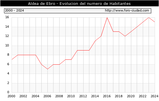 el numero de habitantes en Aldea de Ebro era de 15, 1 habitantes menos que el en el año 2023. En el grafico siguiente se puede ver cuantos habitantes tiene Aldea de Ebro a lo largo de los años.
