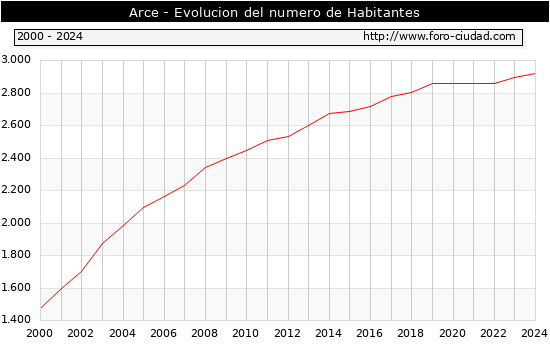el numero de habitantes en Arce era de 2.922, 26 habitantes mas que el en el año 2023. En el grafico siguiente se puede ver cuantos habitantes tiene Arce a lo largo de los años.