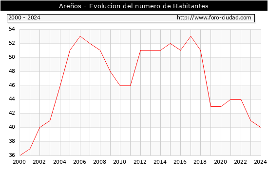 el numero de habitantes en Areños era de 40, 1 habitantes menos que el en el año 2023. En el grafico siguiente se puede ver cuantos habitantes tiene Areños a lo largo de los años.