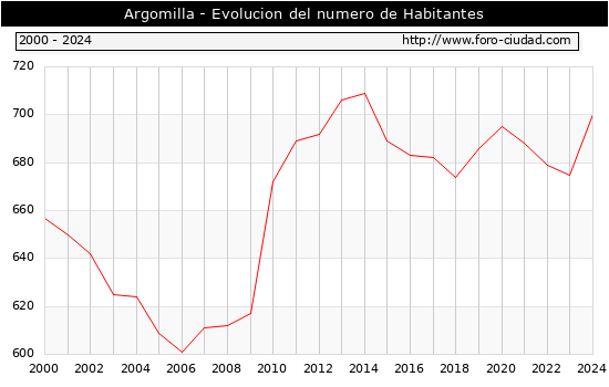 el numero de habitantes en Argomilla era de 700, 25 habitantes mas que el en el año 2023. En el grafico siguiente se puede ver cuantos habitantes tiene Argomilla a lo largo de los años.