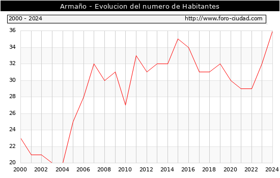 el numero de habitantes en Armaño era de 36, 4 habitantes mas que el en el año 2023. En el grafico siguiente se puede ver cuantos habitantes tiene Armaño a lo largo de los años.