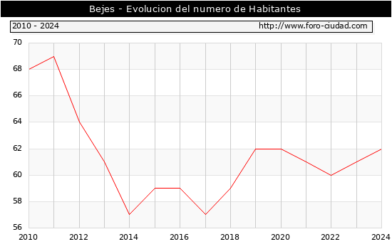 el numero de habitantes en Bejes era de 62, 1 habitantes mas que el en el año 2023. En el grafico siguiente se puede ver cuantos habitantes tiene Bejes a lo largo de los años.
