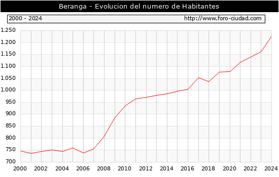 el numero de habitantes en Beranga era de 1.227, 65 habitantes mas que el en el año 2023. En el grafico siguiente se puede ver cuantos habitantes tiene Beranga a lo largo de los años.
