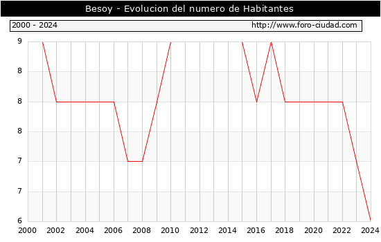 el numero de habitantes en Besoy era de 6, 1 habitantes menos que el en el año 2023. En el grafico siguiente se puede ver cuantos habitantes tiene Besoy a lo largo de los años.