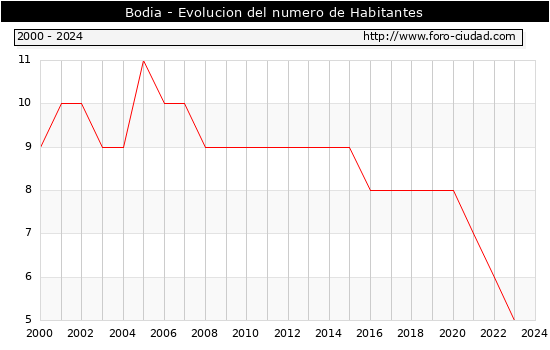 el numero de habitantes en Bodia era de 5, igual numero de habitantes que el en el año 2023. En el grafico siguiente se puede ver cuantos habitantes tiene Bodia a lo largo de los años.