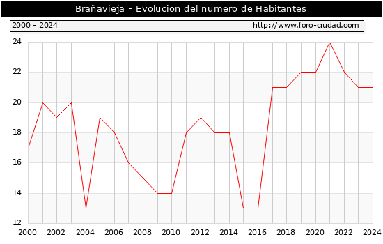 el numero de habitantes en Brañavieja era de 21, igual numero de habitantes que el en el año 2023. En el grafico siguiente se puede ver cuantos habitantes tiene Brañavieja a lo largo de los años.