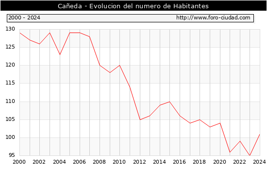 el numero de habitantes en Cañeda era de 101, 6 habitantes mas que el en el año 2023. En el grafico siguiente se puede ver cuantos habitantes tiene Cañeda a lo largo de los años.