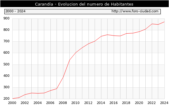 el numero de habitantes en Carandía era de 872, 22 habitantes mas que el en el año 2023. En el grafico siguiente se puede ver cuantos habitantes tiene Carandía a lo largo de los años.