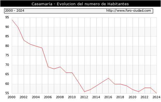 Segun los datos publicados por el INE a 1 de Enero de 2024 el numero de habitantes en Casamaría era de 55, 3 habitantes menos que el en el año 2023. En el grafico siguiente se puede ver cuantos habitantes tiene Casamaría a lo largo de los años.