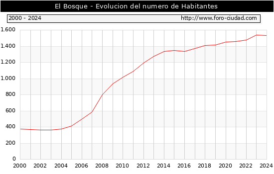 el numero de habitantes en El Bosque era de 1.530, 9 habitantes menos que el en el año 2023. En el grafico siguiente se puede ver cuantos habitantes tiene El Bosque a lo largo de los años.