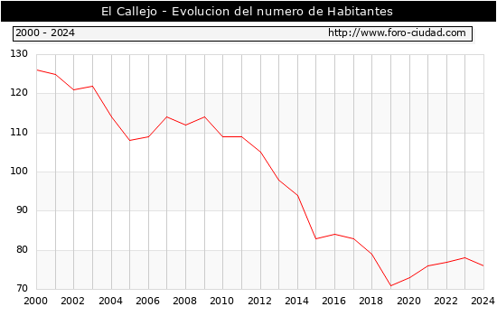 Segun los datos publicados por el INE a 1 de Enero de 2024 el numero de habitantes en El Callejo era de 76, 2 habitantes menos que el en el año 2023. En el grafico siguiente se puede ver cuantos habitantes tiene El Callejo a lo largo de los años.
