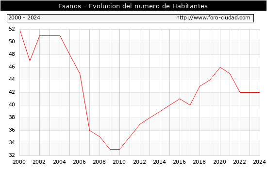 el numero de habitantes en Esanos era de 42, igual numero de habitantes que el en el año 2023. En el grafico siguiente se puede ver cuantos habitantes tiene Esanos a lo largo de los años.